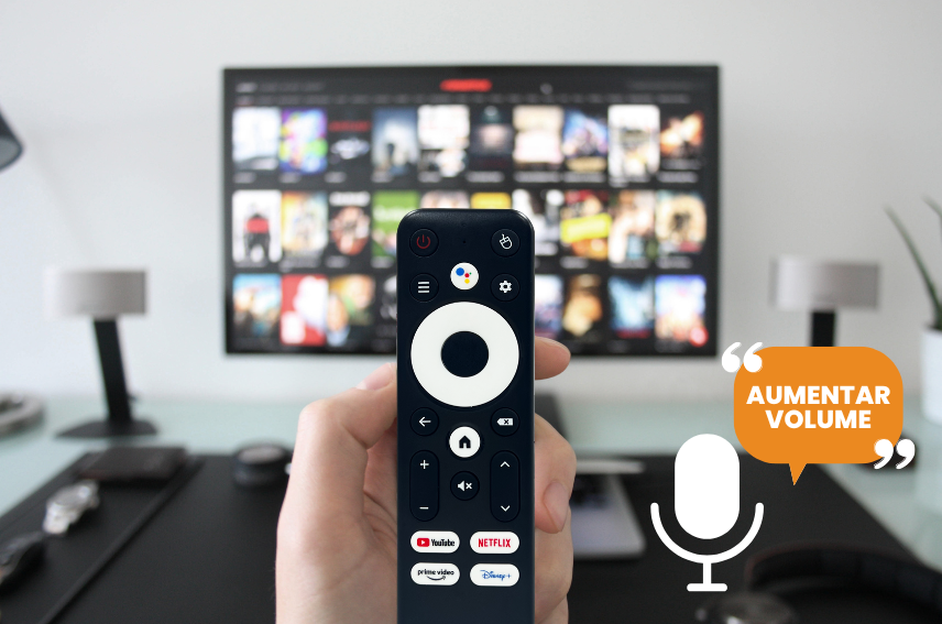 Seu controle remoto possui atalhos para melhorar sua experiência, como Comando de Voz, botão de mouse para melhor fluidez do cursor, botões de home (início), Netflix®, Prime Video®, YouTube® e Disney+®.